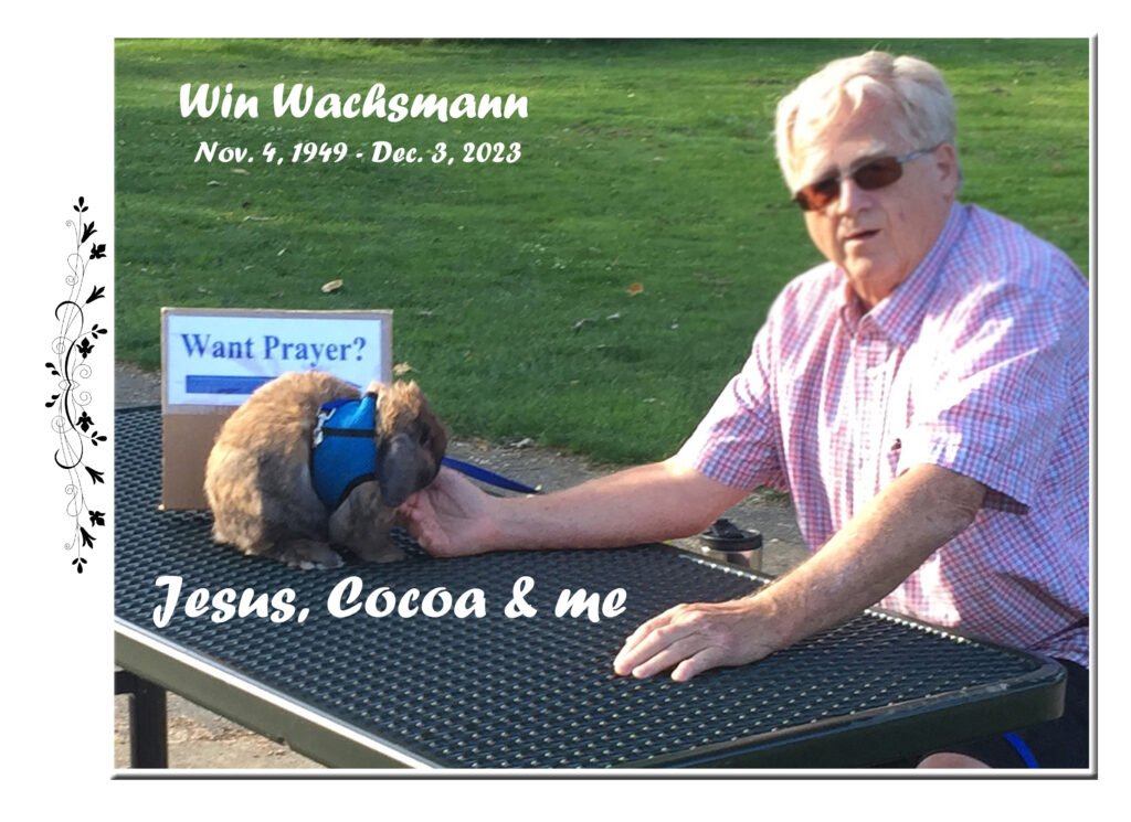 Since 2020 we also started a prayer and encouragement ministry at Mill Lake Park. Win takes our rabbit called Cocoa, sits at a table near Kariton House and offers prayer, hope and encouragement to those who stop by. Peter Roed at Salvation Army will attest to our ministry.